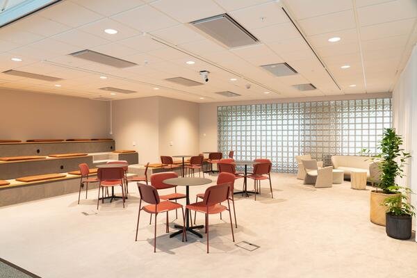 Här kan man också sitta som i en arena på olika nivåer – gradäng. I detta rum finner ni även en webbkamera och högtalare/mikrofon i taket som kan streama ditt möte.
