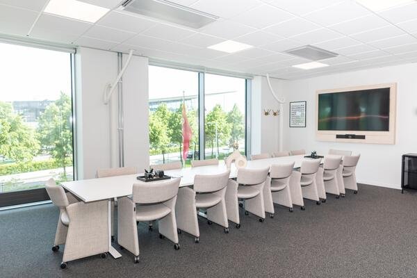 Har gardiner som gör att man kan sitta och ha ett möte ostört och det finns gott om ljus i lokalen.