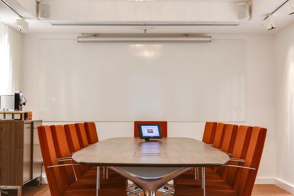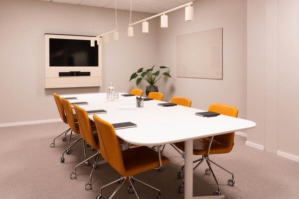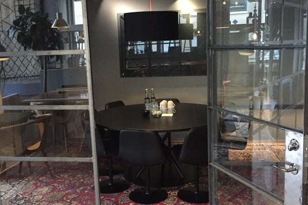 Runda bordet är vårt minsta konferensrum med plats för upp till 6 personer. Mötesrummet har en 55’’ TV med HDMI-uttag för smidig uppkoppling. Här finns också en blackboard, men föredrar ni blädderblock så ordnar vi det. Rummet är sobert inrett och stolar såväl som bord är klädda i svart skinn.
